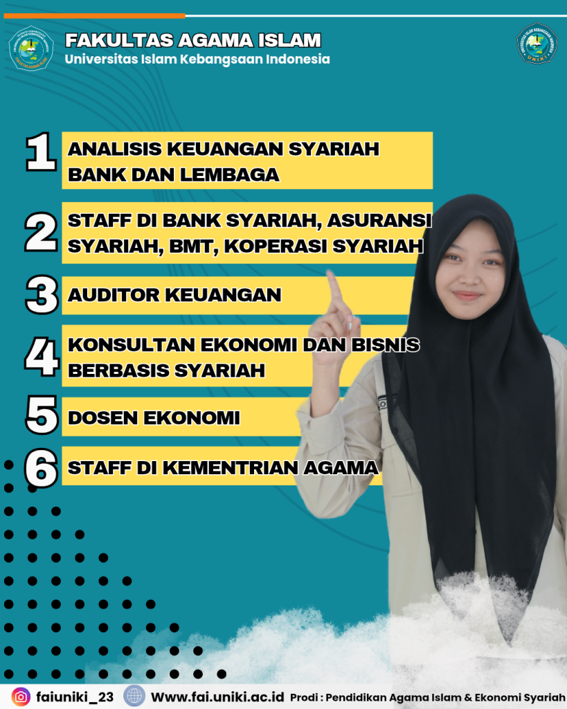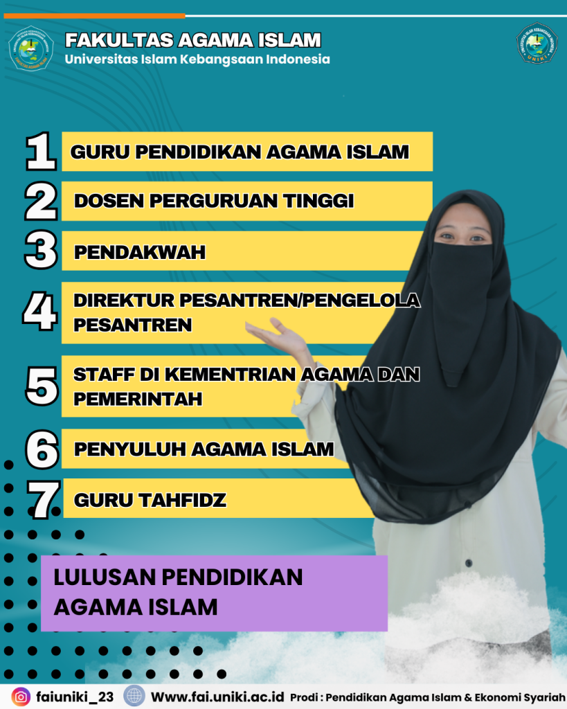 Program Studi Pendidikan Agama Islam (PAI) dirancang untuk melahirkan lulusan yang kompeten di bidang pendidikan dan keagamaan. Lulusan PAI FAI UNIKI memiliki peluang berkiprah sebagai guru Pendidikan Agama Islam, dosen perguruan tinggi, pendakwah, penyuluh agama, pengelola dan pimpinan pesantren, staf Kementerian Agama dan instansi pemerintah, hingga guru tahfidz Al-Qur’an. Keunggulan prodi ini diperkuat dengan pembelajaran kitab kuning, bahasa Arab–Melayu, serta pembinaan karakter melalui pesantren mahasiswa.