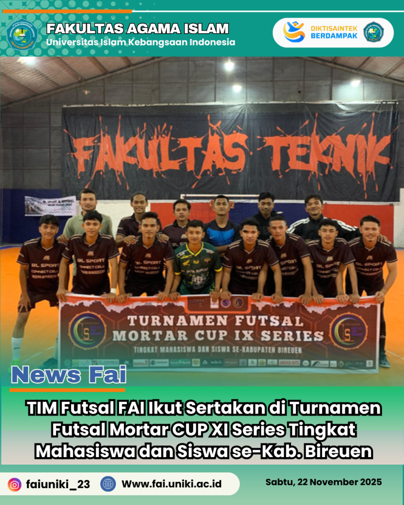 Bireuen, Sabtu 22 November 2025 — Fakultas Agama Islam (FAI) Universitas Islam Kebangsaan Indonesia (UNIKI) kembali menunjukkan eksistensinya dalam ajang non-akademik. Kali ini, Tim Futsal FAI UNIKI turut berpartisipasi dalam Turnamen Futsal Mortar Cup XI Series, yang mempertemukan para pemain terbaik tingkat mahasiswa dan siswa se-Kabupaten Bireuen.